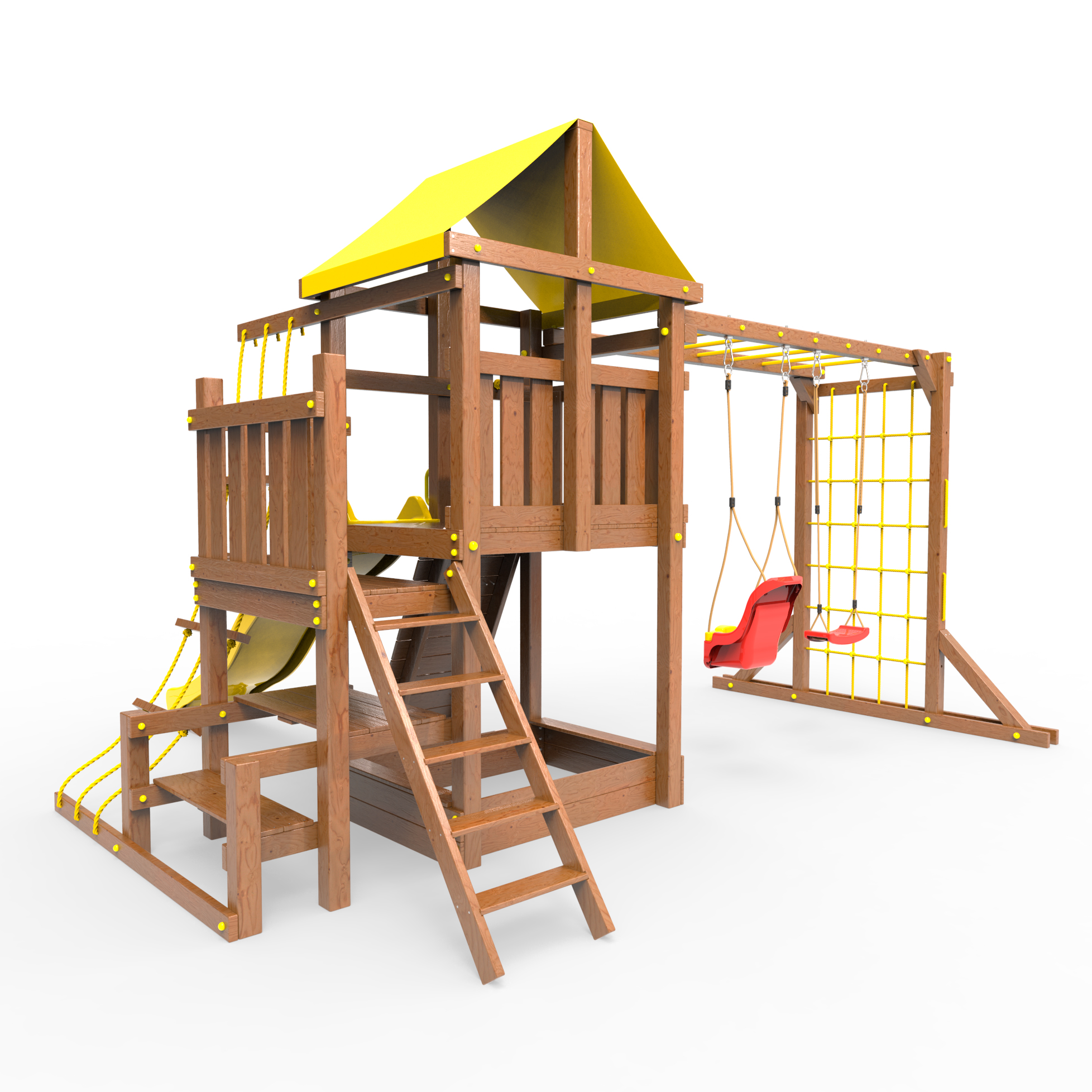 | Комплектация | Домик|Песочница|Лестница|Шторм-трап|Скалодром|Балкон|Столик с лавочками|Горка|Качели|Рукоход|Руфер|Сеть для лазания |