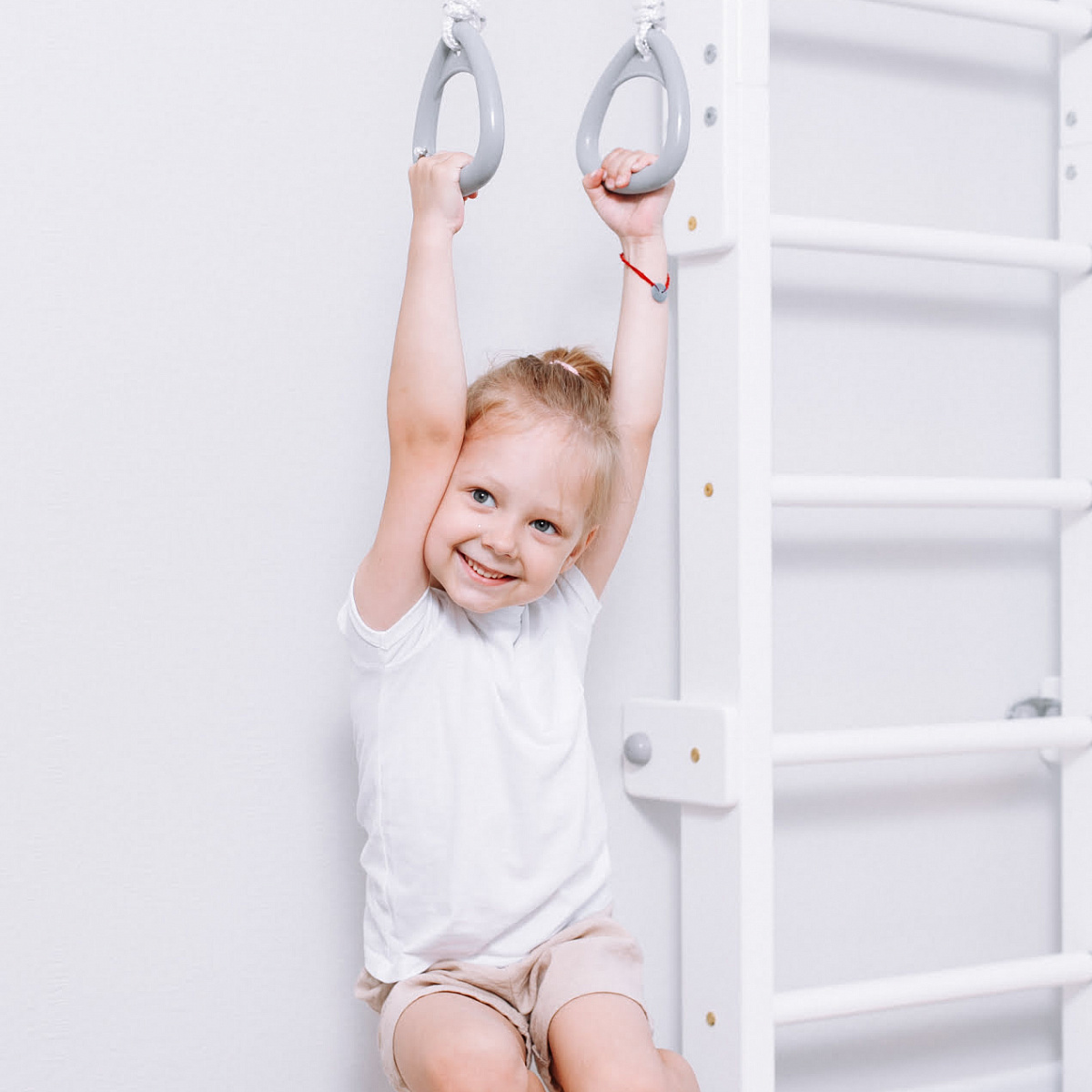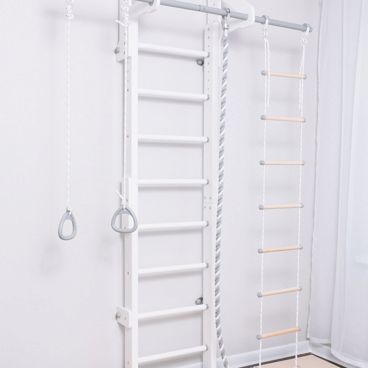 ROMANA Eco2.1 - это дополненная прочным турником и навесным оборудованием модель деревянной шведской стенки в белом цвете.