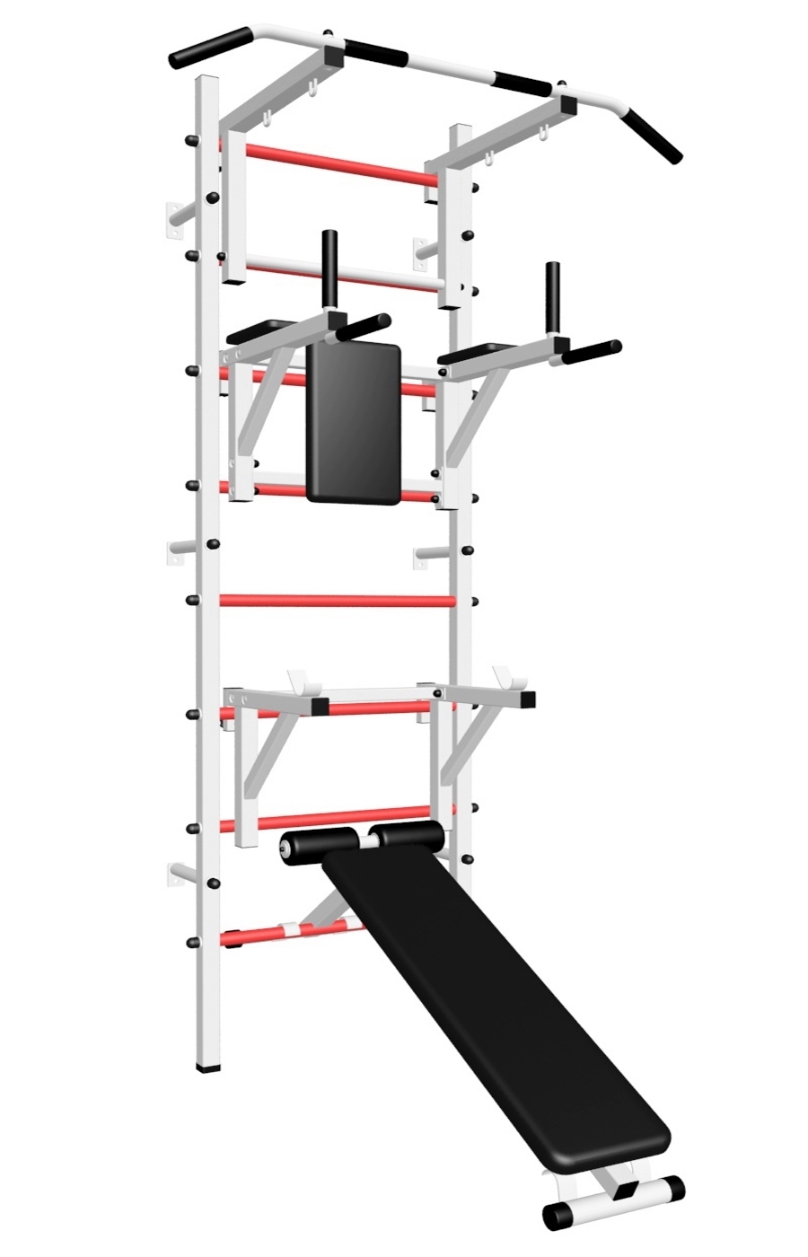 Стойки шведской стенки Sv Sport усиленные изготовлены из профильной трубы 60 х 40 х 2 мм. Ступени изготовлены из круглой, стальной трубы, покрытой резиной (не скользят, не натирают мозоли, не прокручиваются, не имеют запаха, приятны на ощупь). Устанавливается к стене при помощи 6 кронштейнов. На перекладину, в местах хватов, одеты резиновые ручки.