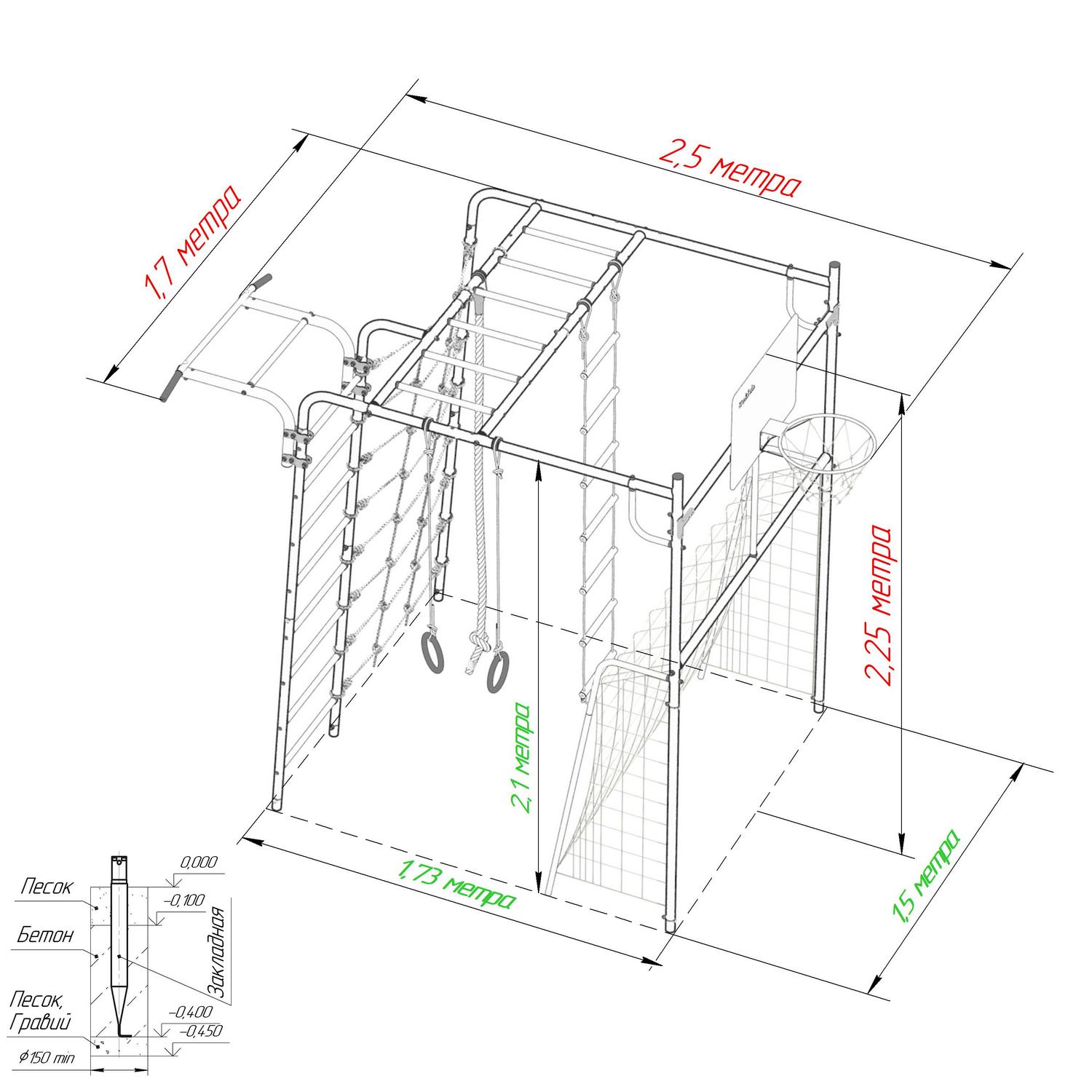 - Комплектация Ворота, сетка для лазания, кольца гимнастические, канат, кольцо баскетбольное, лестница веревочная, турник (регулируемый по высоте), рукоход, ступени ПВХ